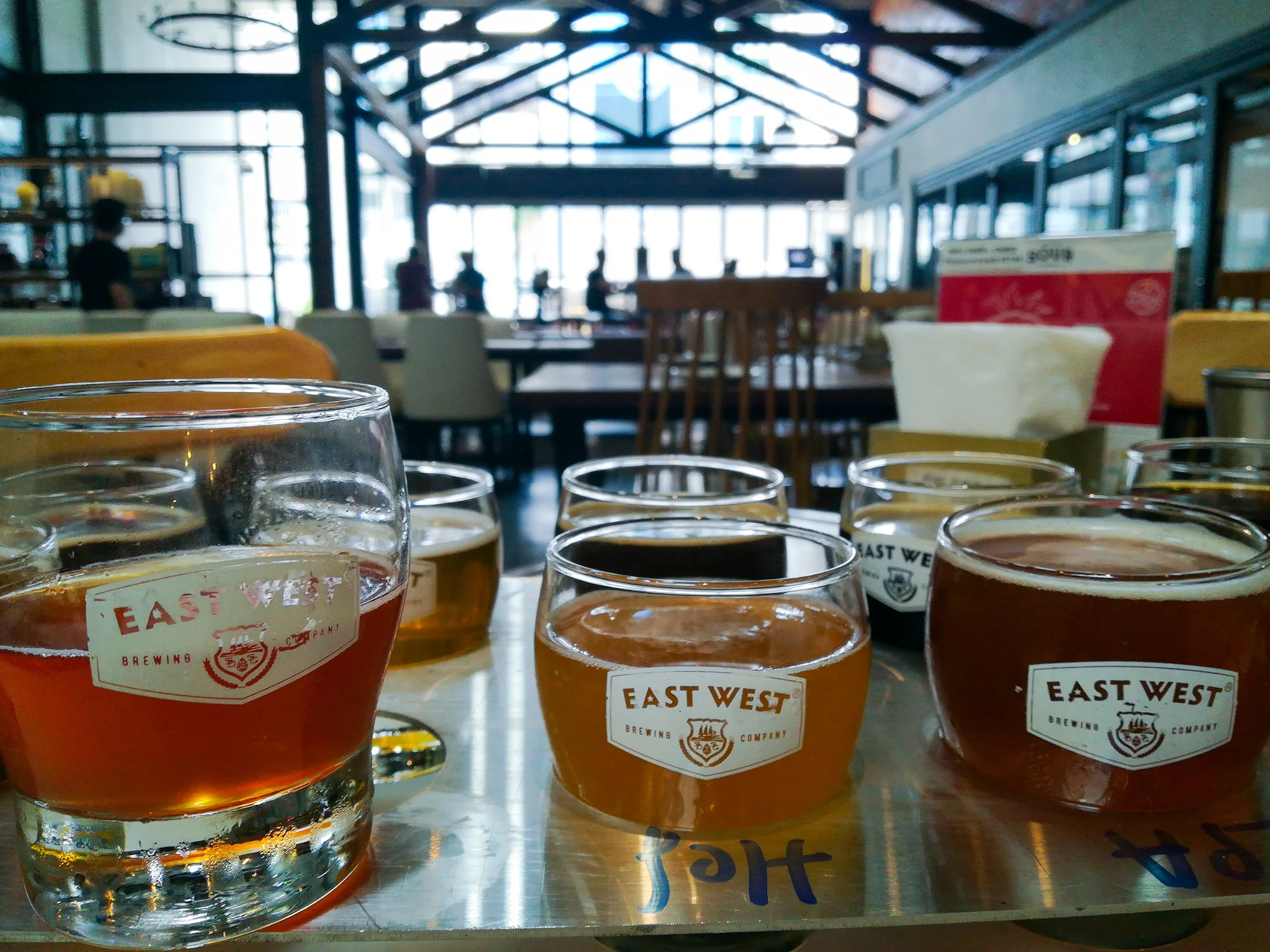 We went to visit East West, one of the most popular modern microbreweries in HCMC. Located in the heart of District 1 at Ly Tu Trong Street, EW specialises in a fusion of different crafting traditions to create some interesting flavours. We ordered the King’s Flight for 10 different choices from their menu, along with shakshouka and gorgeously cooked medium-rare pork collar with greens (which I didn’t get a picture of because I ate it.)